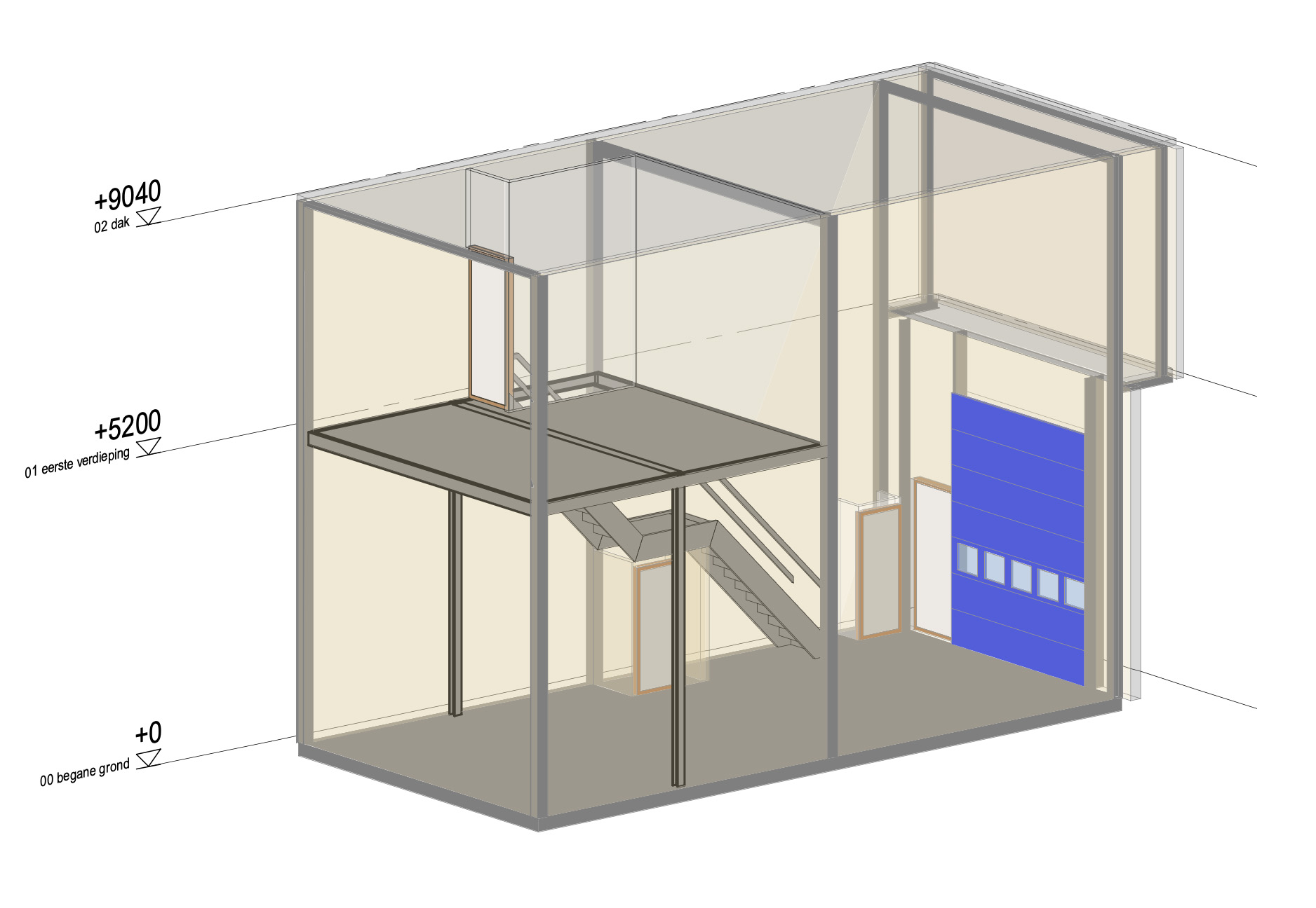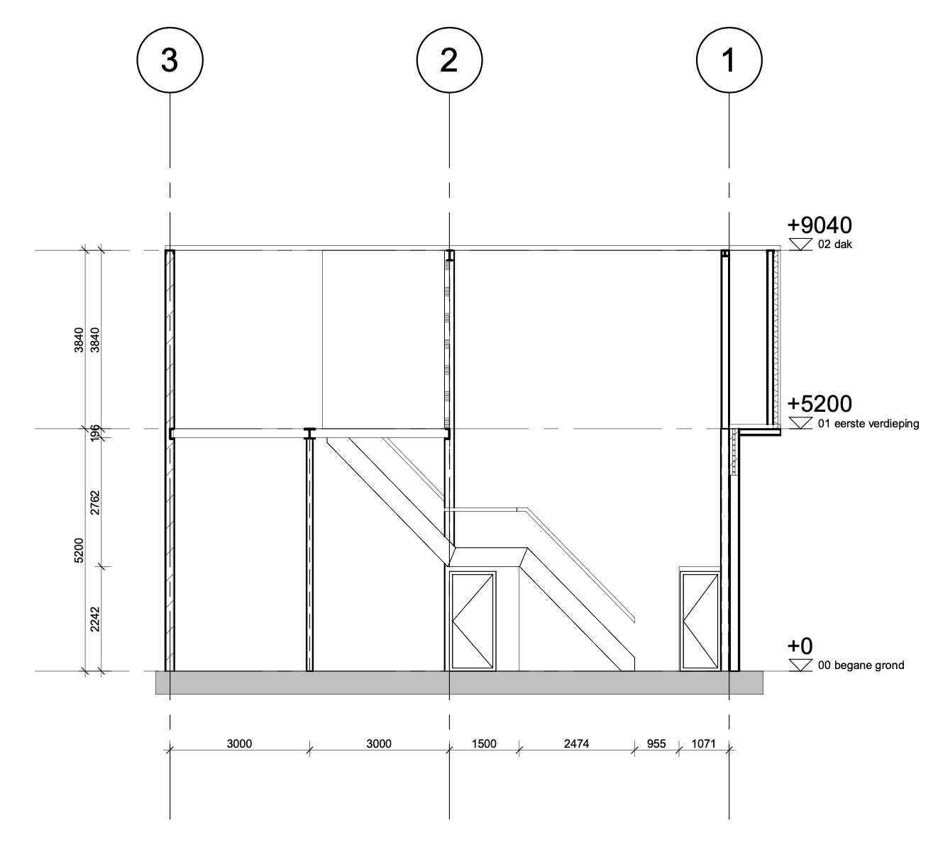 Met aanzichten bedoelen we gevelaanzichten. Hierin staan de materialisatie, de afmetingen van de gevelopeningen zoals ramen en deuren, en de peilhoogte van de vloer. Ook de draairichtingen van deuren en ramen zijn hierin af te lezen.
